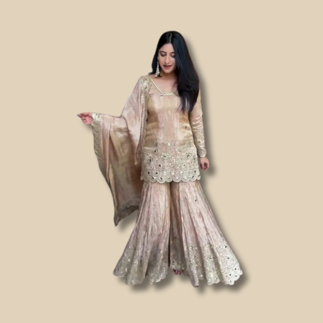 This stunning embroidered sharara set in beige is designed to make you stand out at any special occasion. Crafted from luxurious net fabric, this three-piece ensemble features intricate sequin work that catches the light beautifully, adding a touch of glamour to your look. The set includes an elegantly embroidered kurta with delicate detailing, a flowing sharara with exquisite border work, and a matching dupatta that completes the outfit perfectly. The scalloped hemline adds a sophisticated finish to both the kurta and sharara, whilst the sheer net fabric with embellishments creates an ethereal, feminine silhouette. Ideal for weddings, festive celebrations, and party wear, this sharara suit combines traditional craftsmanship with contemporary style. The beige colour palette makes it versatile and easy to accessorise with statement jewellery. The comfortable fit ensures you can move with ease whilst looking absolutely radiant. This carefully designed outfit is perfect for those who appreciate fine detailing and want to make a memorable impression at any celebration.