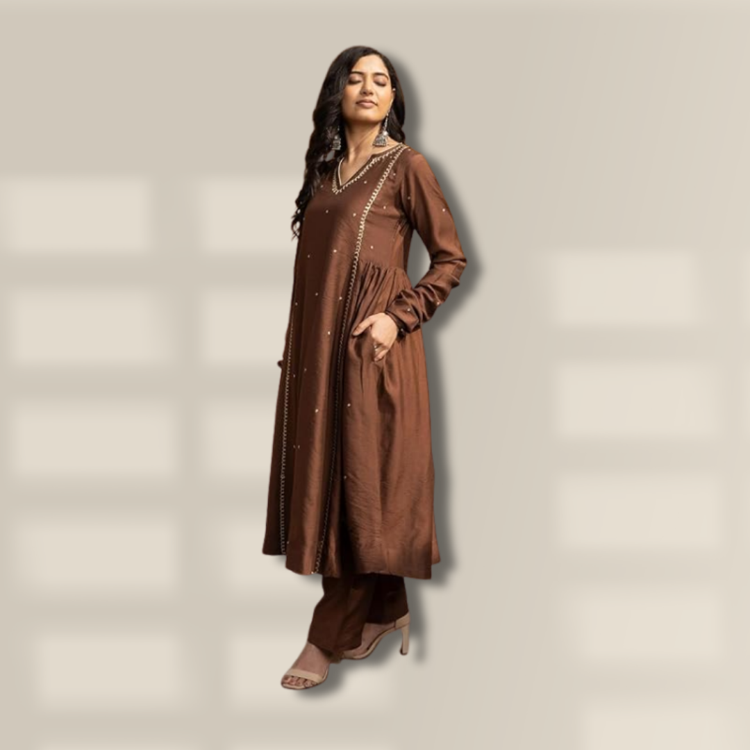 Embrace understated elegance with this stunning brown Anarkali kurta set, designed to offer a perfect blend of grace and sophistication. Crafted from smooth, high-quality fabric, the kurta features a flattering flared silhouette that drapes beautifully, enhancing movement and comfort. The rich brown hue is complemented by subtle embellishments and fine detailing along the neckline and panel, adding a touch of refined charm without overpowering the look.